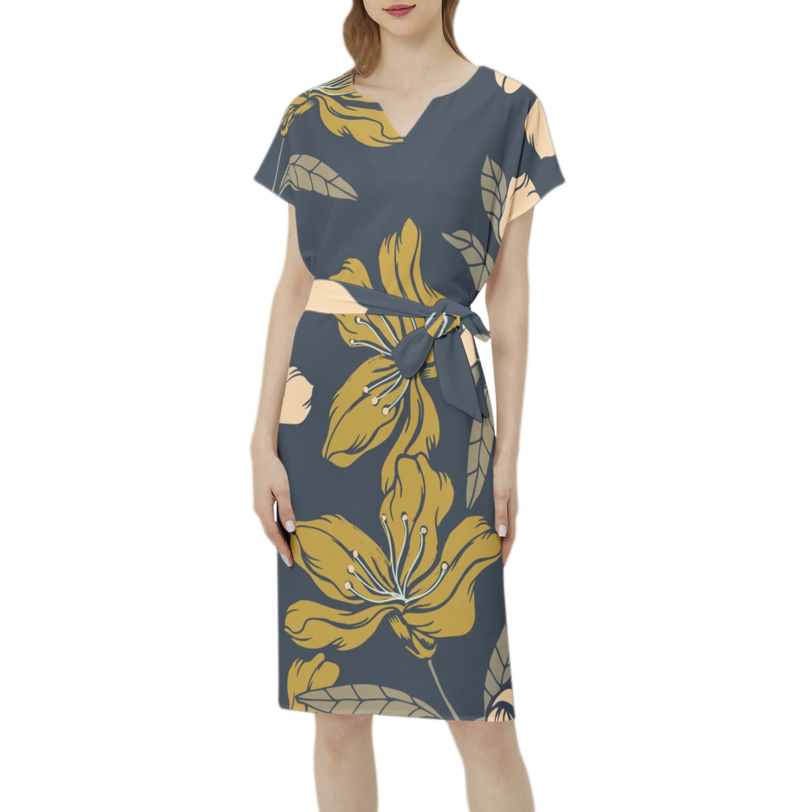 Batwing sleeve, Notched neck, Belt tie waist, Straight hem, Tunic, Casual dress