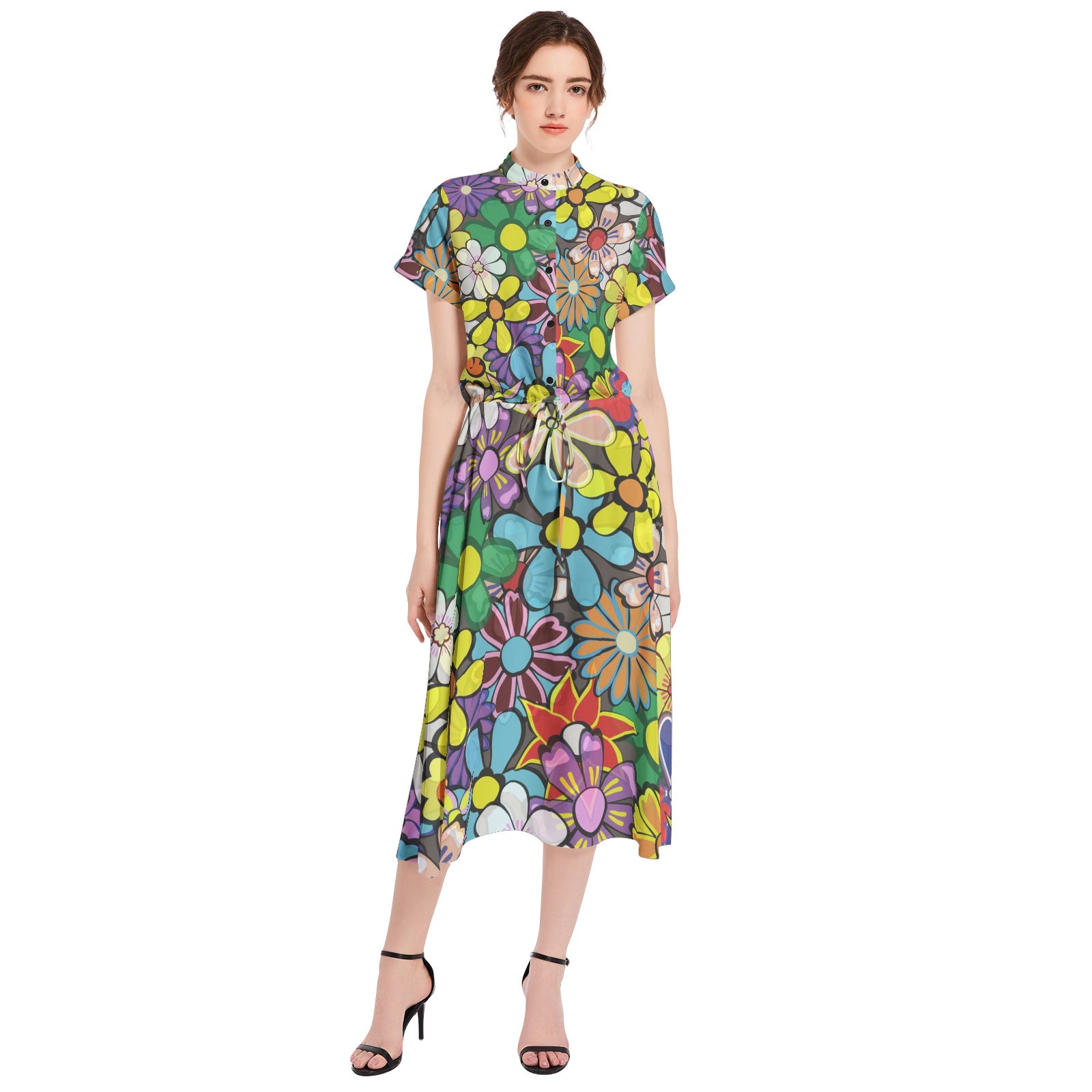 Butterfly short sleeve, Button top, Drawstring waist, Flared hem, Two inseam pockets, Women's casual midi dress